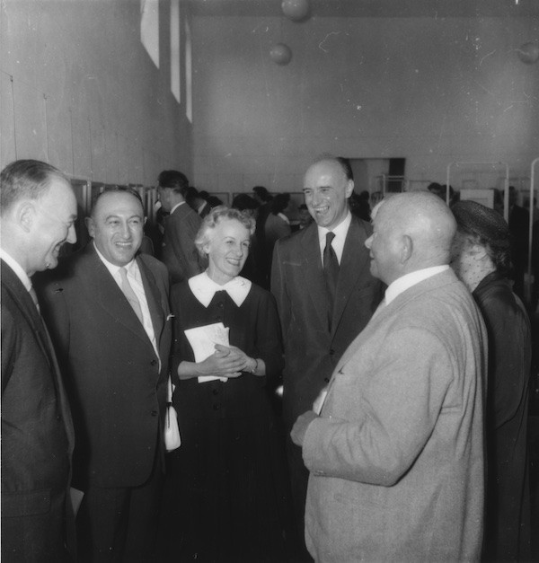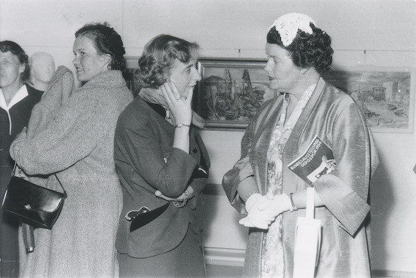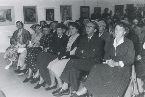 On October 27, 1953 the Kunstverein opened its new premises at Galeriestraße 4, which are still in use to this day. In the early years from 1954 to 1956, freelance photojournalist Felicitas Timpe continuously photographed the exhibition openings.[21] Her photographs allow one to get an impression of the exhibition displays and social settings. The following section focuses on the interpersonal encounters during the openings.