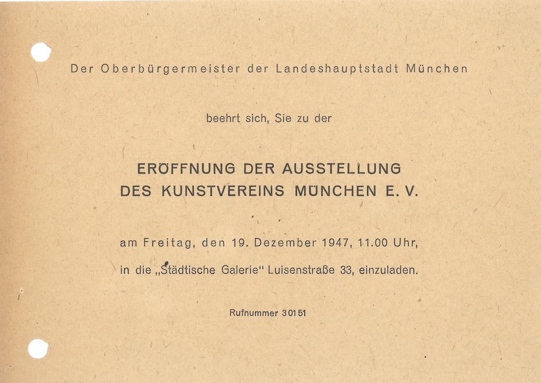 Following Christian Fuhrmeister’s Archive Newsletter The Kunstverein München during the Nazi Era. What to Ask? How to Research?, Leona Koldehoff turns her attention to the period around 1950. The term “around” is used here as a precise preposition. As a method of approximation, it enables engagement with a historically specific yet unstable temporal configuration. “Around 1950” here refers to a period shaped by the aftermath of the World War II, institutional restructuring, and the contingencies of artistic and social networks across shifts in political systems. And it is within this indeterminate temporal configuration that Leona Koldehoff reconstructs the institutional framework and exhibition program of the Kunstverein München, tracing the complex interchange between actors, spaces, and artistic positions.