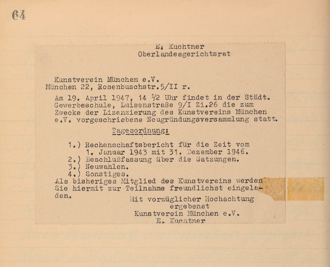 [9] Minutes, General Assembly, April 19, 1947, in “Protokollbuch Kunstverein München e.V.” (see note 7). Why Eberhard Kuchtner assumed responsibility for convening the first general assembly after World War II, coordinating the licensing process, and serving as first chairman from 1947 to 1956 has not yet been clarified. In a speech delivered at a general assembly in 1954, Kuchtner described himself as a “court-appointed guardian.” [Translated from the German original by the author.] The typescript of the speech forms part of the estate of Edeltraud Kuchtner, Eberhard Kuchtner’s sister. See “Rede Eberhard Kuchtner, General Assembly, March 1954,” Hanns Seidel Foundation, Archive for Christian Social Politics (Hanns-Seidel-Stiftung, Archiv für Christlich-Soziale Politik), reference code: NL Kuchtner Edeltraud: Abgabe_45, Munich. Many thanks to Stefan Obermeier for providing the archival materials.