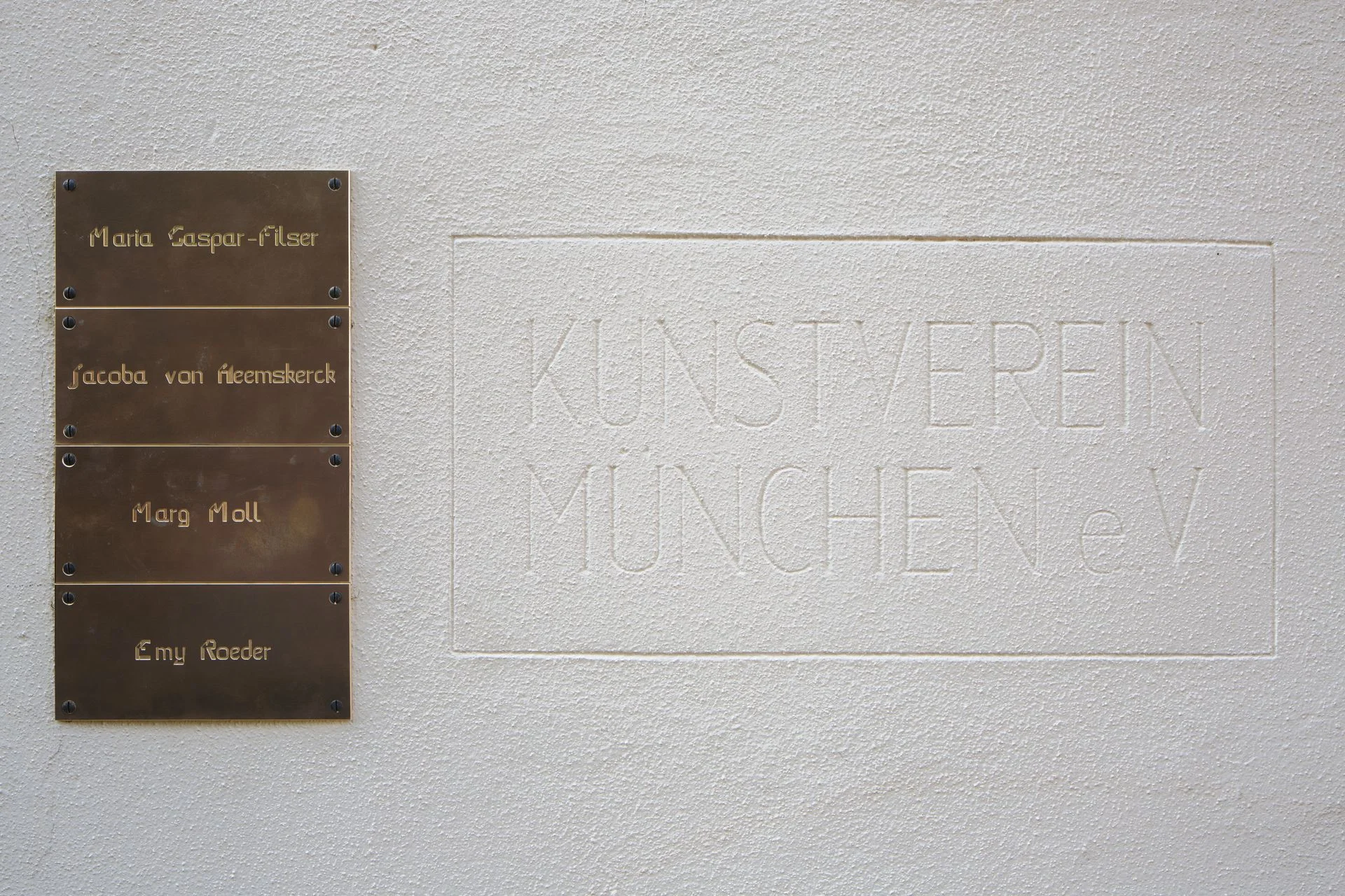 Im Rahmen ihrer Einzelausstellung No River to Cross von 2021 hat Bea Schlingelhoff vier Plaketten außen am Kunstvereinsgebäude montiert, die den einzigen Künstlerinnen der Münchner “Entarteten Kunst”-Ausstellung gewidmet sind: Maria Caspar-Filser, Jacoba van Heemskerck, Marg Moll und Emy Roeder. Die Namen sind im von Schlingelhoff gestalteten Typeface Marianne Baum graviert. Die Plaketten bleiben permanent installiert, um so die nicht-kanonisierten weiblichen Positionen wieder (oder überhaupt erst) ins öffentliche Blickfeld zu rücken. Darüber hinaus nehmen die Plaketten den Platz eines von städtischer Seite her bislang versäumten Erinnerungszeichens im öffentlichen Raum ein.