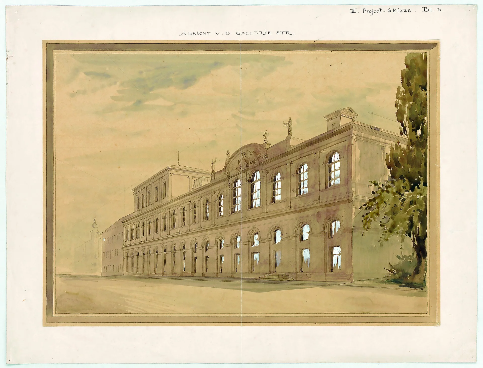 Friedrich von Thiersch, Ansicht v. d. Gallerie str., II. Project-Skizze. Bl.3., Teil einer Sammlung von Zeichnungen und Skizzen zum Umbauprojekt des Kunstvereinsgebäudes
