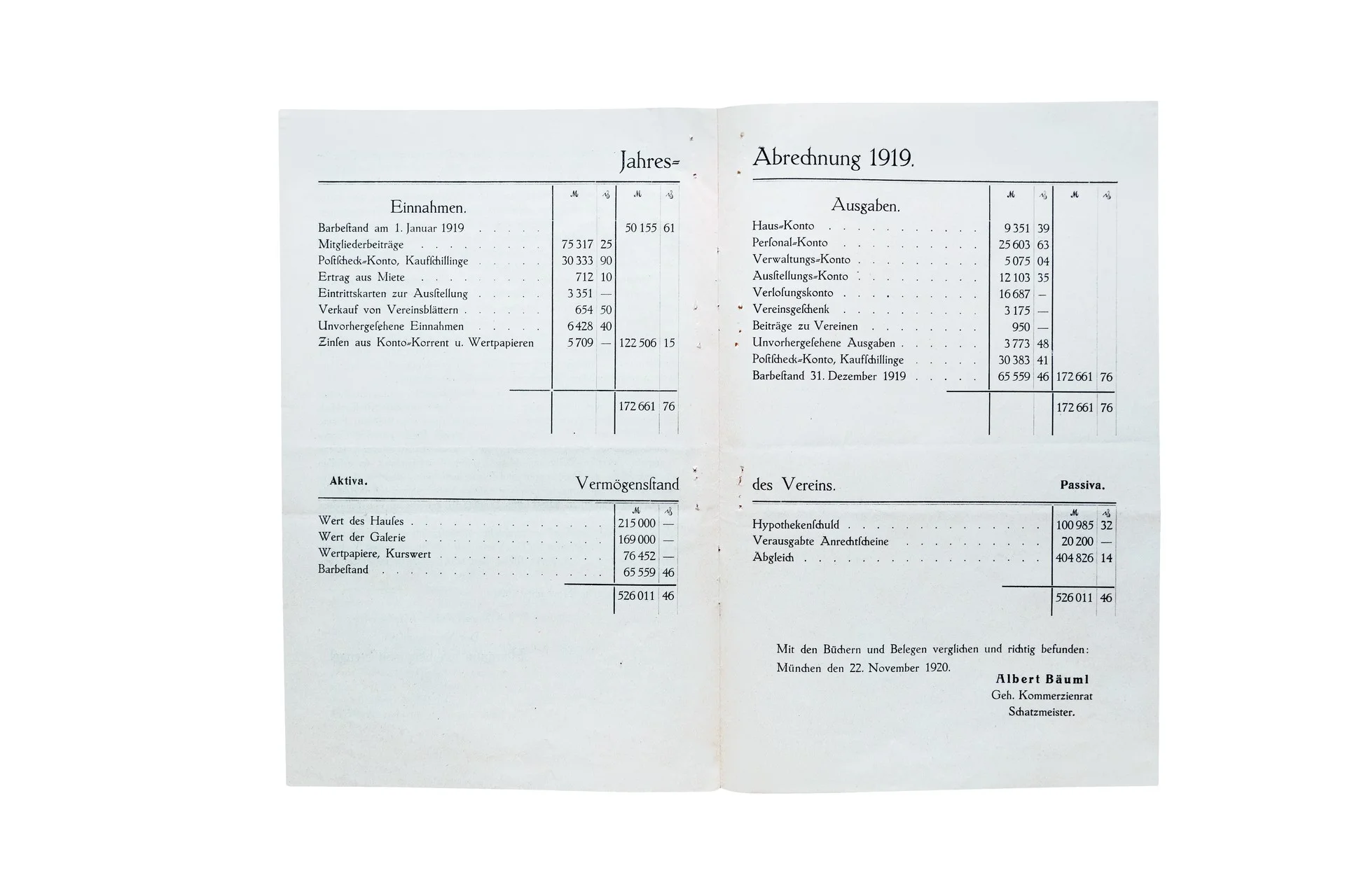 Jahresbericht über die Einnahmen und Ausgaben sowie über den aktiven und passiven Vermögensstand des Kunstverein München 1919
