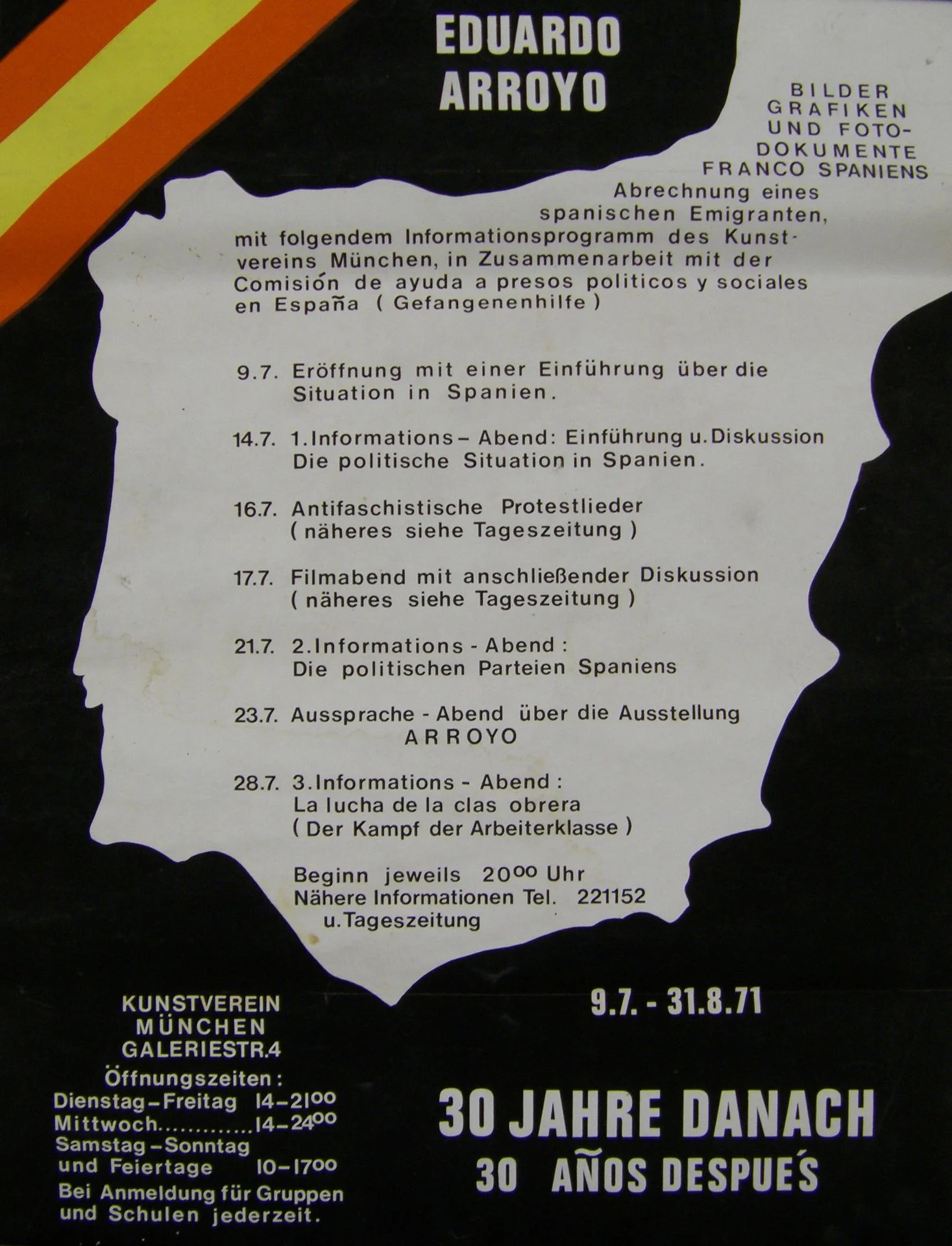 „Der Künstler (Eduardo Arroyo), der letzthin für die Bremer Oper Bühnenbilder schuf, wurde 1937 während des spanischen Bürgerkrieges in Madrid geboren, er verließ sein Heimatland jedoch nach kurzer journalistischer Tätigkeit und Militärdienst im Alter von einundzwanzig Jahren. Die Farben Rot-Gelb-Rot, Spaniens Nationalfarben, sind für ihn ein Trauma geworden. Wie auch vielen anderen, voran Picasso.