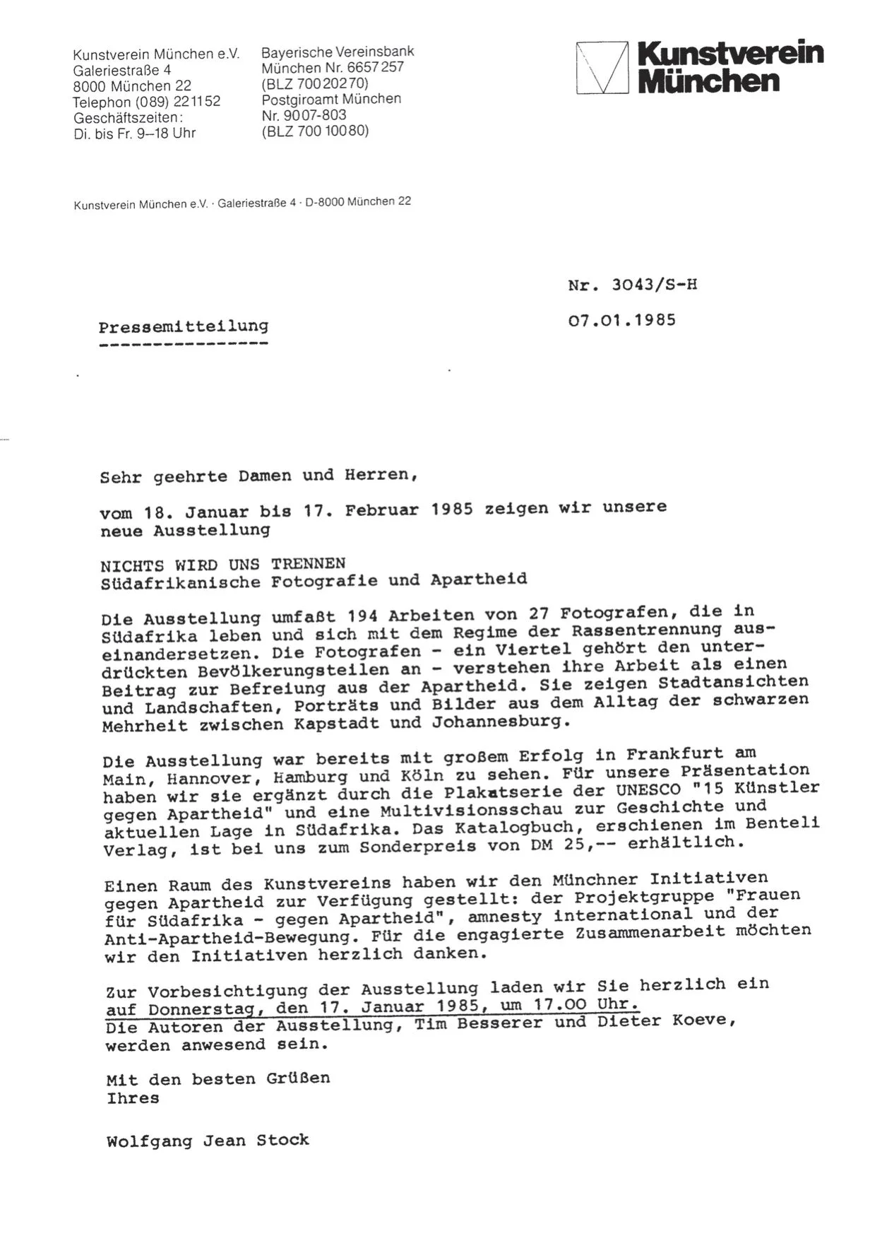 „Die Ausstellung Nichts wird uns trennen [so kündigt die Pressemitteilung vom 7. Januar 1985 an] umfasst 194 Arbeiten von 27 Fotografen, die in Südafrika leben und sich mit dem Regime der Rassentrennung auseinandersetzen. Die Fotografen – ein Viertel gehört den unterdrückten Bevölkerungsteilen an – verstehen ihre Arbeit als einen Beitrag zur Befreiung aus der Apartheid. Sie zeigen Stadtansichten und Landschaften, Porträts und Bilder aus dem Alltag der schwarzen Mehrheit zwischen Kapstadt und Johannesburg. Die Ausstellung war bereits mit großem Erfolg in Frankfurt am Main, Hannover, Hamburg und Köln zu sehen. Für unsere Präsentation haben wir sie ergänzt durch die Plakatserie der UNESCO „15 Künstler gegen Apartheid“ und eine Multivisionsschau zur Geschichte und aktuellen Lage in Südafrika [...] Einen Raum des Kunstvereins haben wir den Münchner Initiativen gegen Apartheid zur Verfügung gestellt: der Projektgruppe ‚Frauen für Südafrika – gegen Apartheid‘, amnesty international und der Anti-Apartheid-Bewegung. Für die engagierte Zusammenarbeit möchten wir den Initiativen herzlich danken.“ Der Ausstellung folgte eine Strafanzeige der Deutsch-Südafrikanischen Gesellschaft wegen „Werbung und Unterstützung für eine terroristische Vereinigung“ gegen den Kunstverein. Grund hierfür war insbesondere die Einladung von Tony Seedat, einem Vertreter des African National Congress (ANC), zu einem Gesprächsabend. In einem Schreiben der Deutsch-Südafrikanischen Gesellschaft heißt es: „Bei dem ‚African National Congress‘ (ANC) handelt es sich um eine von Funktionären der verbotenen Kommunistischen Partei Südafrikas gelenkte terroristische Vereinigung im Sinne des deutschen Strafrechts, deren Zwecke und Tätigkeit darauf gerichtet sind, Mord, Totschlag, gemeingefährliche Straftaten und solche gegen die persönliche Freiheit zu begehen.“ Der ANC, zu dessen prominentesten Mitgliedern Nelson Mandela gehörte, wurde von 1960 bis 1990 in Südafrika illegalisiert; er war eine führende Kraft, nicht zuletzt durch im Exil lebende Mitglieder, im Kampf gegen die südafrikanische Apartheid. Das Verbot wurde am 2. Februar 1990 aufgehoben. Die Strafanzeige gegen den Kunstverein wurde fallengelassen.