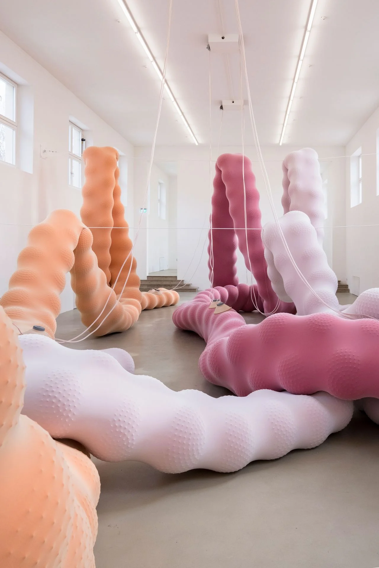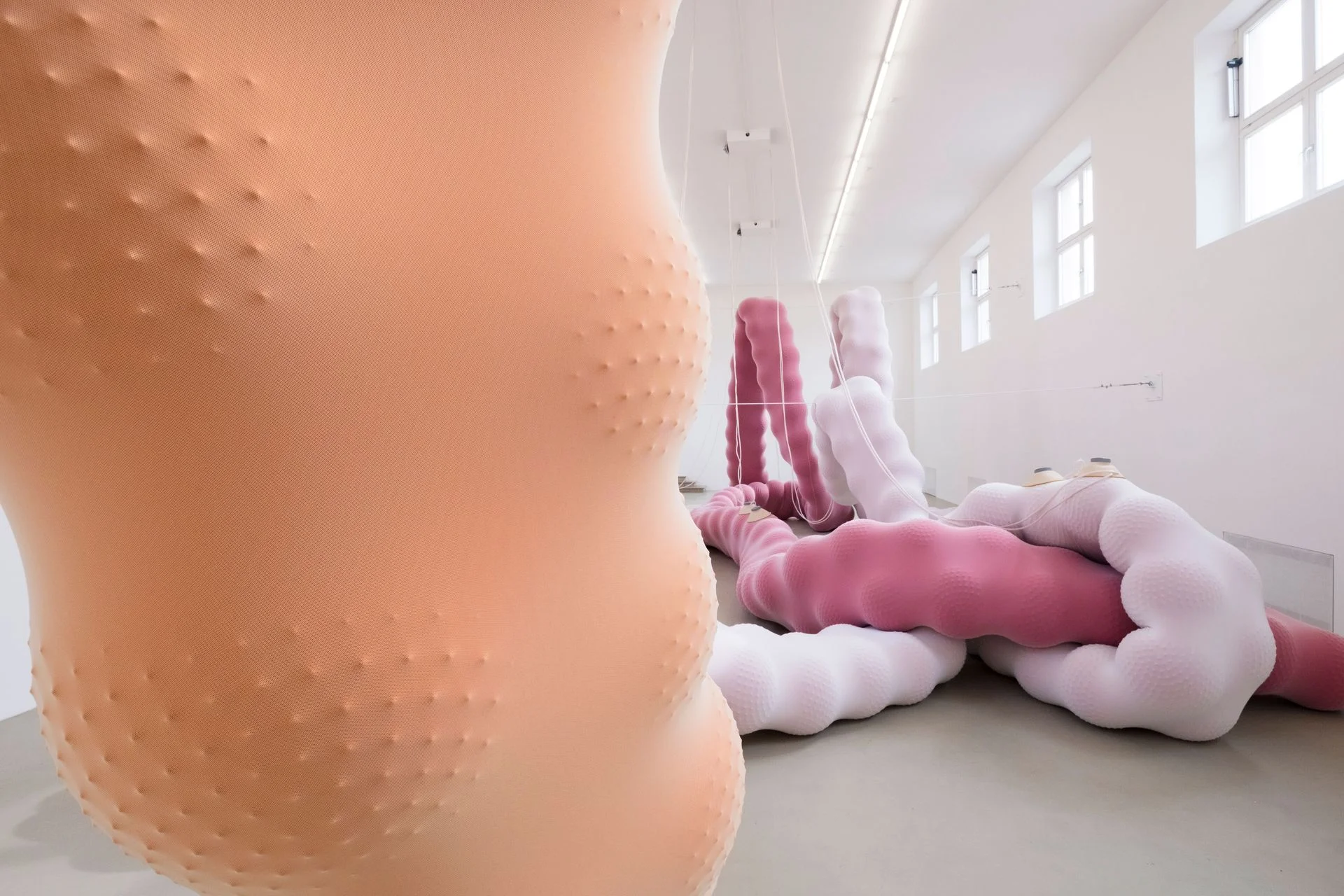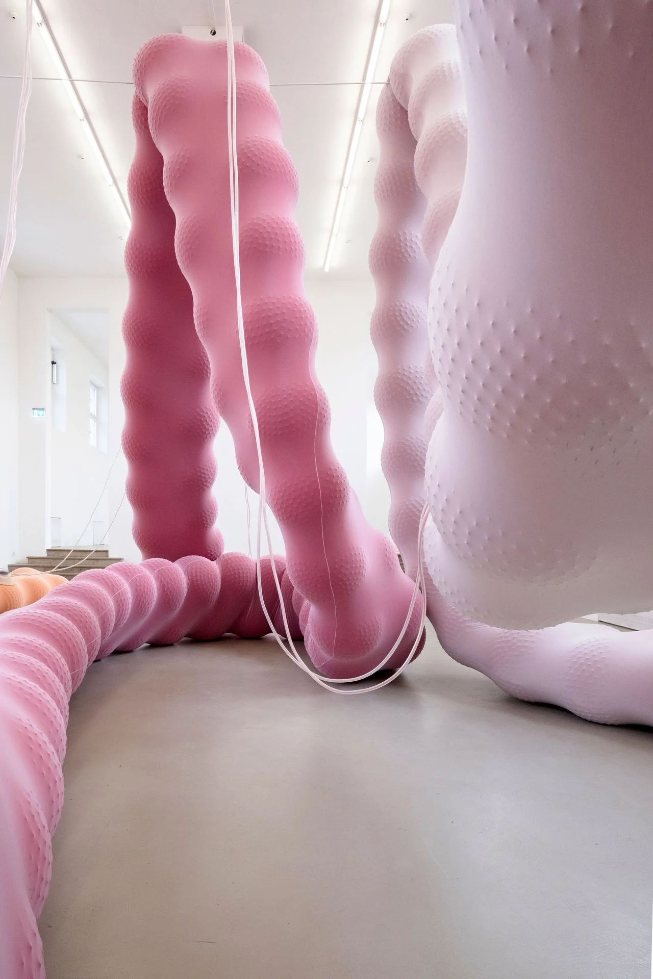 Das Hauptwerk der Ausstellung ist eine groß angelegte, immersive 8-Kanal Soundinstallation, die aus drei bauchigen und strukturierten „Inflatables“ besteht, welche mit Meshgewebe umspannt. Verworrene Ranken aus medizinischen Schläuchen sind an die gigantischen, verdrehten Röhren angebracht. Das Ganze ist mit einem Soundverstärker verbunden, der nicht nur die Materialität der Skulpturen zum Leben erweckt, sondern sie auch zu widerhallenden Membranen transformiert. Die jamaikanischen Produzenten für elektronische Musik, Equiknoxx, haben eigens für diese Installation einen Soundtrack produziert, der auf die Themen der Ausstellung Bezug nimmt mittels ihrer idiosynkratischen Verwendung von kakophonischen Samples, elastischen Dancehall ‚Riddims‘ und einer gewaltigen Sub-Bass Dub Produktion. Indem diese Installation Eigenheiten des taktilen Klangs, einer akustisch-taktilen Synästhesie und der Psychoakustik einsetzt, regt sie veränderte Bewusstseinszustände und ein verändertes Körperbewusstsein an, indem der Akt des Zuhörens auf den Bereich der Haut und der Knochen, der taktilen Sphäre, übertragen wird. Ähnlich zu pulsierenden Geräten in der Physiotherapie oder einem Soundsystem in einem Club ermöglicht es die Installation dem Beat, verschiedene Körper und Formen von Materie zu ergreifen und zu umspannen, wodurch materielle Kommunikation und Interaktion zwischen sehr unterschiedlichen Wesen, menschlich und nicht-menschlich, ermöglicht wird, und wodurch räumliche und somatische Effekte ausgelöst werden.