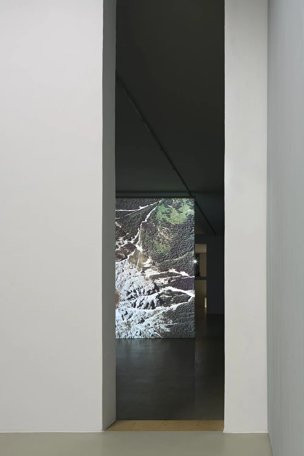 In seiner neuen, zur Ausstellung gleichnamigen Arbeit verhandelt Kolling diese komplexen sozio-politischen wie ökonomischen Beziehungen. Die Filmprojektion zeigt die grobe Rekonstruktion eines Fluges der Hansa Luftbild auf Basis von Bildern aus den Lesebüchern. Die Arbeit wird mit einem modifizierten Projektor vorgeführt und ist in eine raumgreifende Intervention eingebettet, die die Proportionen der Ausstellungsräume verengt. In Nadir befasst sich Kolling mit der (Un-)Möglichkeit, die Welt zu dokumentieren: Bilder der eigentlichen Orte erfahren eine sie reduzierende Abstraktion, die notwendig ist, um die Komplexität der Welt auf einer zweidimensionalen Aufnahme abzubilden. Diese in der fotografischen Methode auftauchende Lücke steht im Zentrum der Ausstellung. Die Lesefähigkeit – im Englischen der deutlich prägnantere Begriff der „literacy“ – von solchen Aufnahmen prägt bis heute unser (Ab-)Bild der Welt.