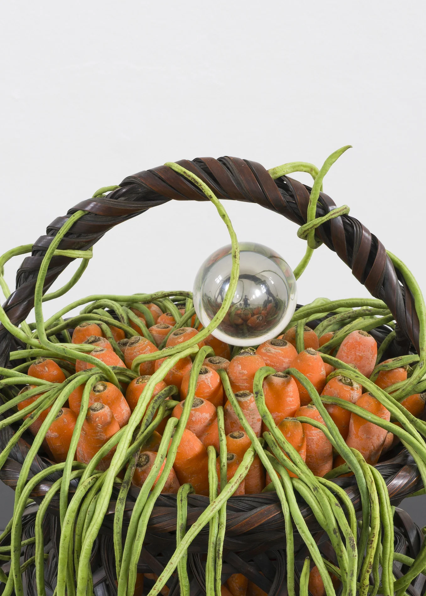 [16] Detail: Christian Kōun Alborz Oldham, Penny Waking up from a Dream, 2025, Karotte, Chinesische Langbohne, reflektierende Kugel, japanischer geflochtener Bambuskorb, in: Flower Planet, Kunstverein München, 2024. Courtesy der Künstler und Kunstverein München e.V.; Foto: Maximilian Geuter.