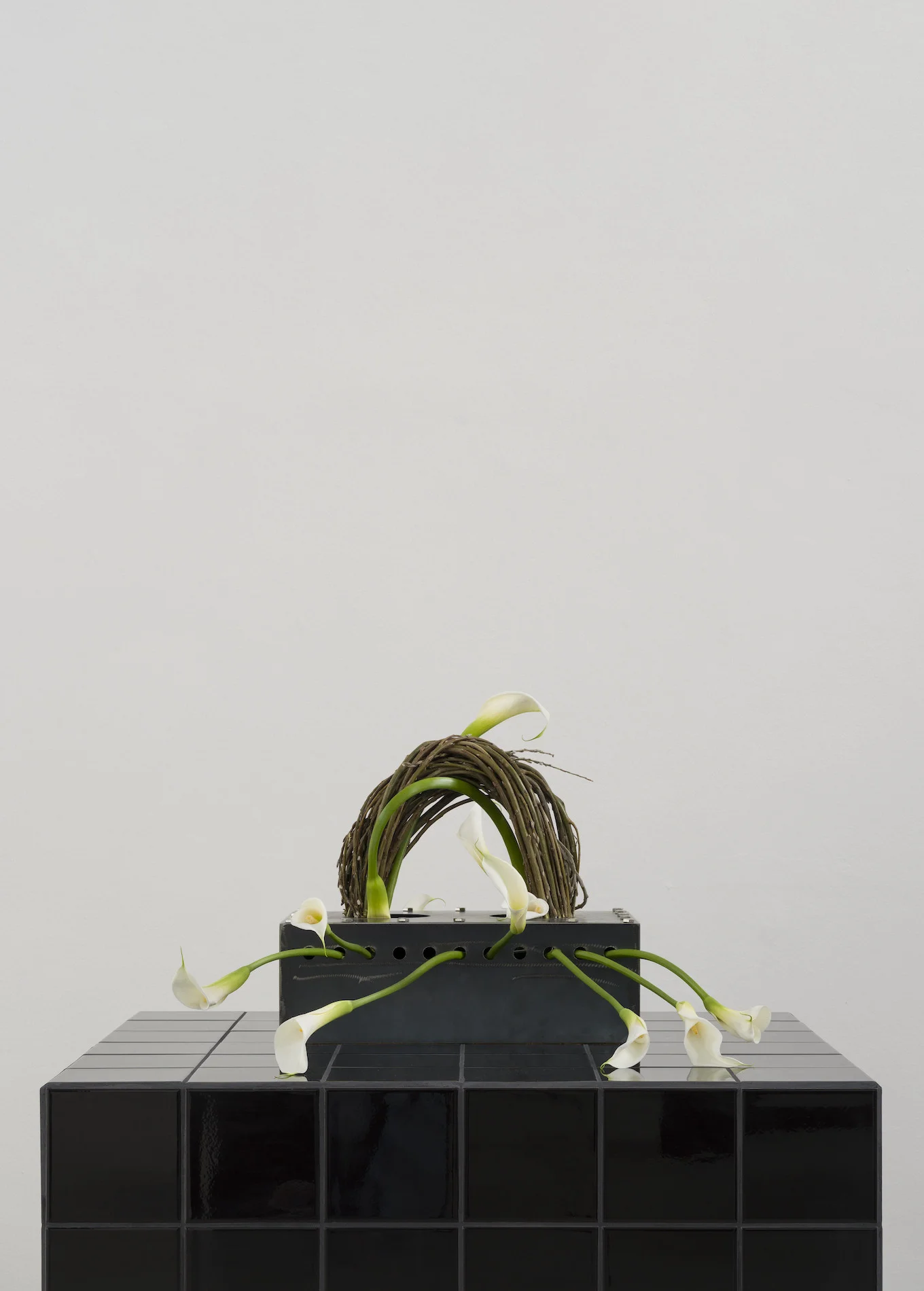 [14] Detail: Kosen Ohtsubo, 怪芋III / Strange Callas III, 2025, Calla-Lilie, Weide, individuell gestalteter Eisenkasten, in: Flower Planet, Kunstverein München, 2024. Courtesy der Künstler und Kunstverein München e.V.; Foto: Maximilian Geuter.