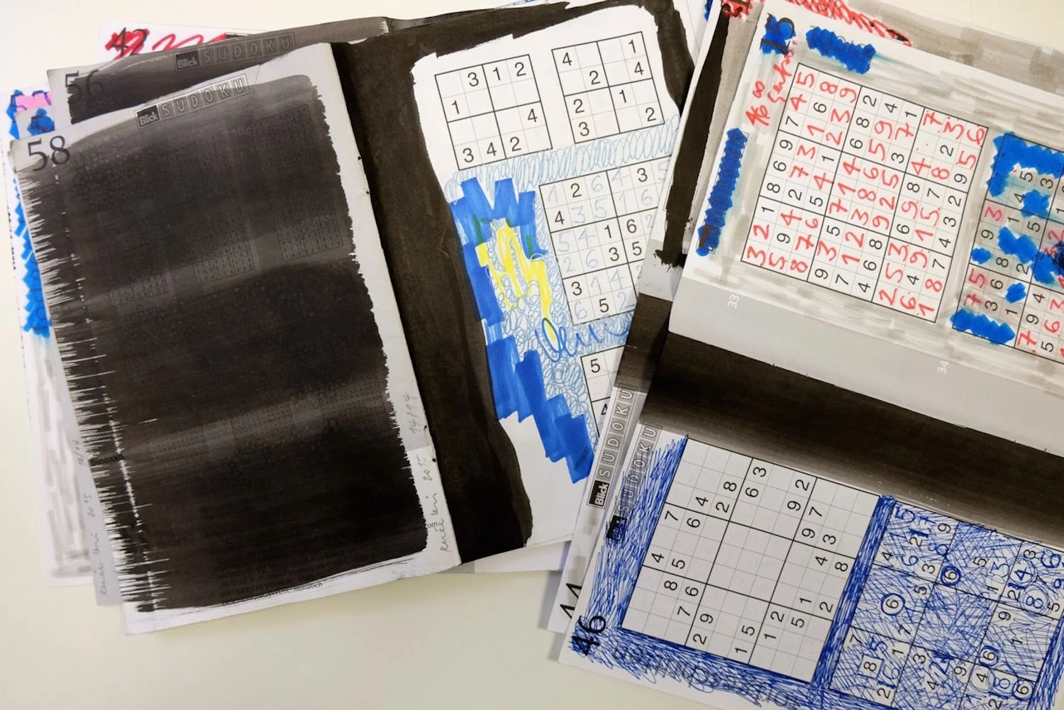 Sudoku ist ein japanisches Logikrätsel, bei dem man schlussfolgern muss, an welche Stellen in einem konzentrischen Quadratraster die Zahlen 1 bis 9 einzufügen sind. Renée Levi, die sich fast täglich mit Sudokus beschäftigt, geht es nicht darum, die richtigen Lösungen zu finden, sondern sich zum Zeichnen anregen zu lassen, Zeichen zu Papier zu bringen und sich in einen unbewussten kreativen Bereich zu begeben. Für die Ausstellung Sudoku im Kunstverein München hat Levi mit ihrer Installation – einem Raster von Bildern auf gespannter Baumwolle im Format 280 x 280 cm entlang der Seiten aller vier Ausstellungsräume – ein Sudoku auf die gesamten Räumlichkeiten übertragen. Ihre neue Edition ist allerdings deutlich kompakter: Levi hat um die Raster in einem Sudoku-Buch herum gemalt, die Buchbindung gelöst und das Buch dann auseinandergenommen, so dass sich beidseitig bedruckte und bemalte Doppelseiten ergeben.