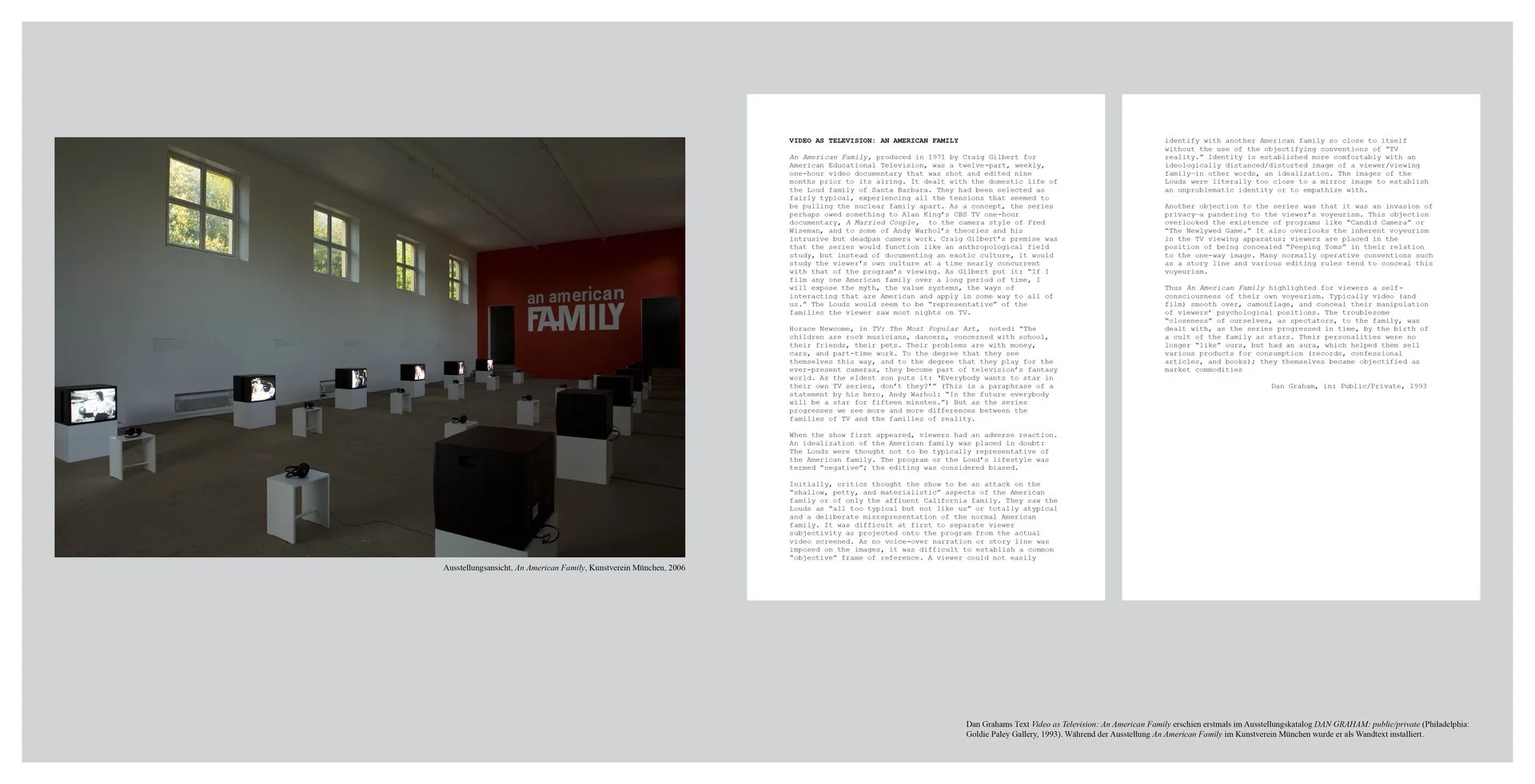 Dan Grahams Interesse für soziale Strukturen zeigt sich auch in seinem Text Video as Television: An American Family, der erstmals 1993 im Ausstellungskatalog public/private (Goldie Paley Gallery) erschien, und der in der Ausstellung An American Family (2006) im Kunstverein München als Wandtext installiert wurde. Darin begreift er die TV-Serie als Spiegel zwischen den Zuschauer*innen und den abgebildeten Identitätskonstrukten. Die Spiegelung, so Graham, sei eine Art disruptiver Impuls im Moment der Identifikation zwischen Zuschauer*in und Protagonist*in.