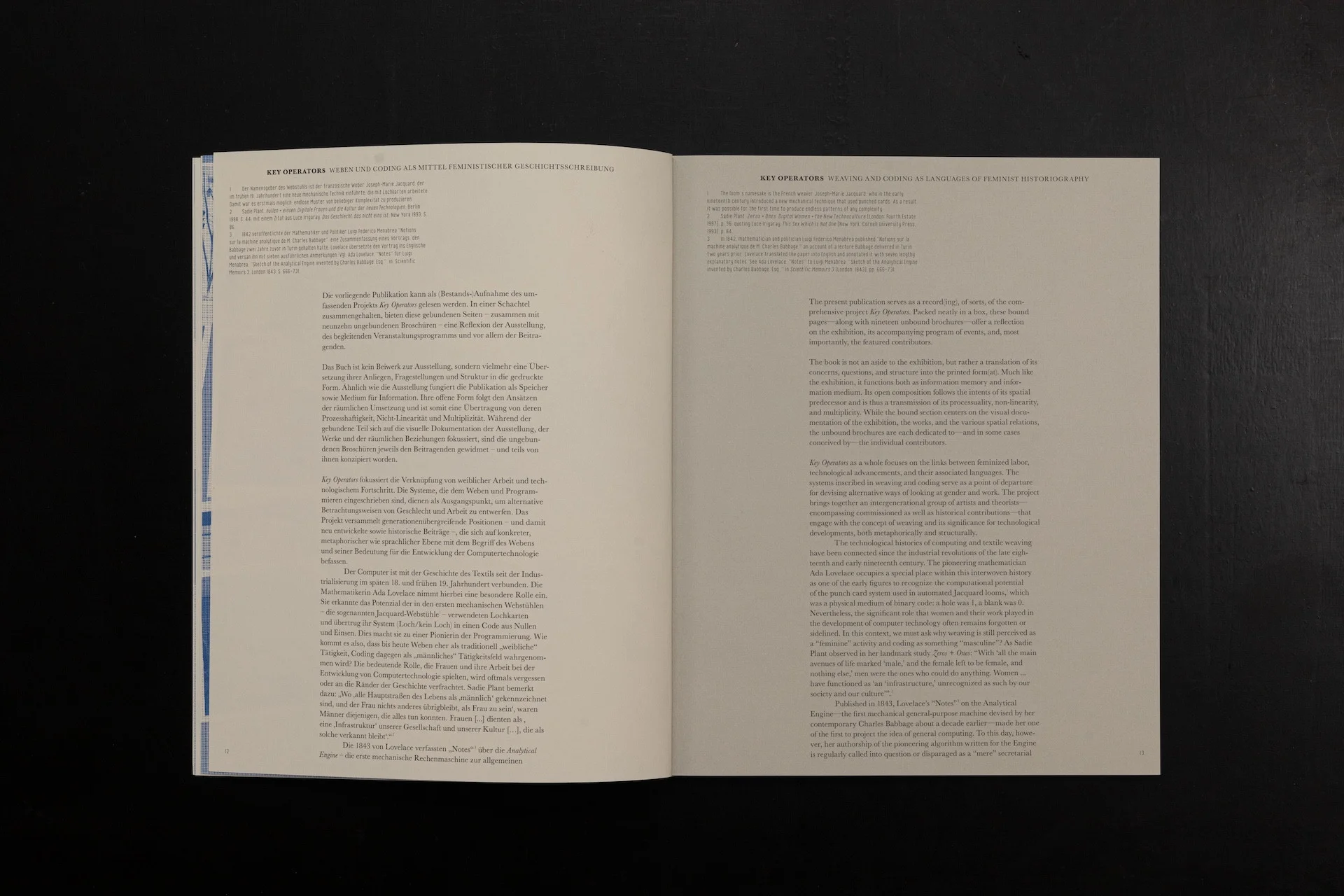 Die Publikation kann als (Bestands-)Aufnahme des umfassenden Projekts Key Operators. Weben und Coding als Mittel feministischer Geschichtsschreibung gelesen werden. In einer Schachtel zusammengehalten, bieten die gebundenen Seiten – zusammen mit neunzehn ungebundenen Broschüren – eine Reflexion der Ausstellung, des begleitenden Veranstaltungsprogramms und vor allem der Beitragenden.