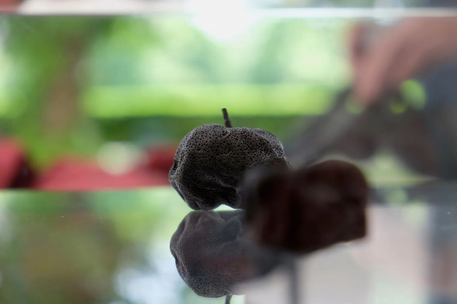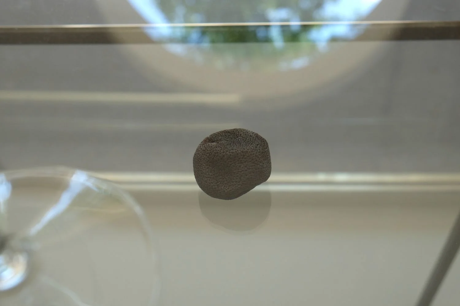 Hinter dem Fenster zum Hofgarten steht auf einem geschweißten Eisentisch eine kleinere Glasvitrine, in der mehrere getrocknete Zitrusfrüchte arrangiert wurden, die mit einer dünnen Schicht Grafit bedeckt sind. Auf der Vitrine stehen zwei Weingläser. Oberti hatte sie mit Wasser gefüllt, dieses verdunsten lassen und den Vorgang so oft wiederholt, bis sich milchiges Kalzium und Kalkstein in Streifen abgelagert haben, die wie ein präziser Zeitmesser (und als Zeugnis einer physikalischen Transformation) funktionieren. Darüber ragen aus dem Hintergrund des Fensters zwei mit Eisenstangen verbundene Dattelzweige auf, die sich zum Hofgarten neigen. Sie bilden eine zweifache Sonnenuhr, deren nebeneinander liegende Schatten sich tagsüber mit dem wechselnden Sonnenstand bewegen und nachts im künstlichen LED-Licht an einem Punkt verharren.