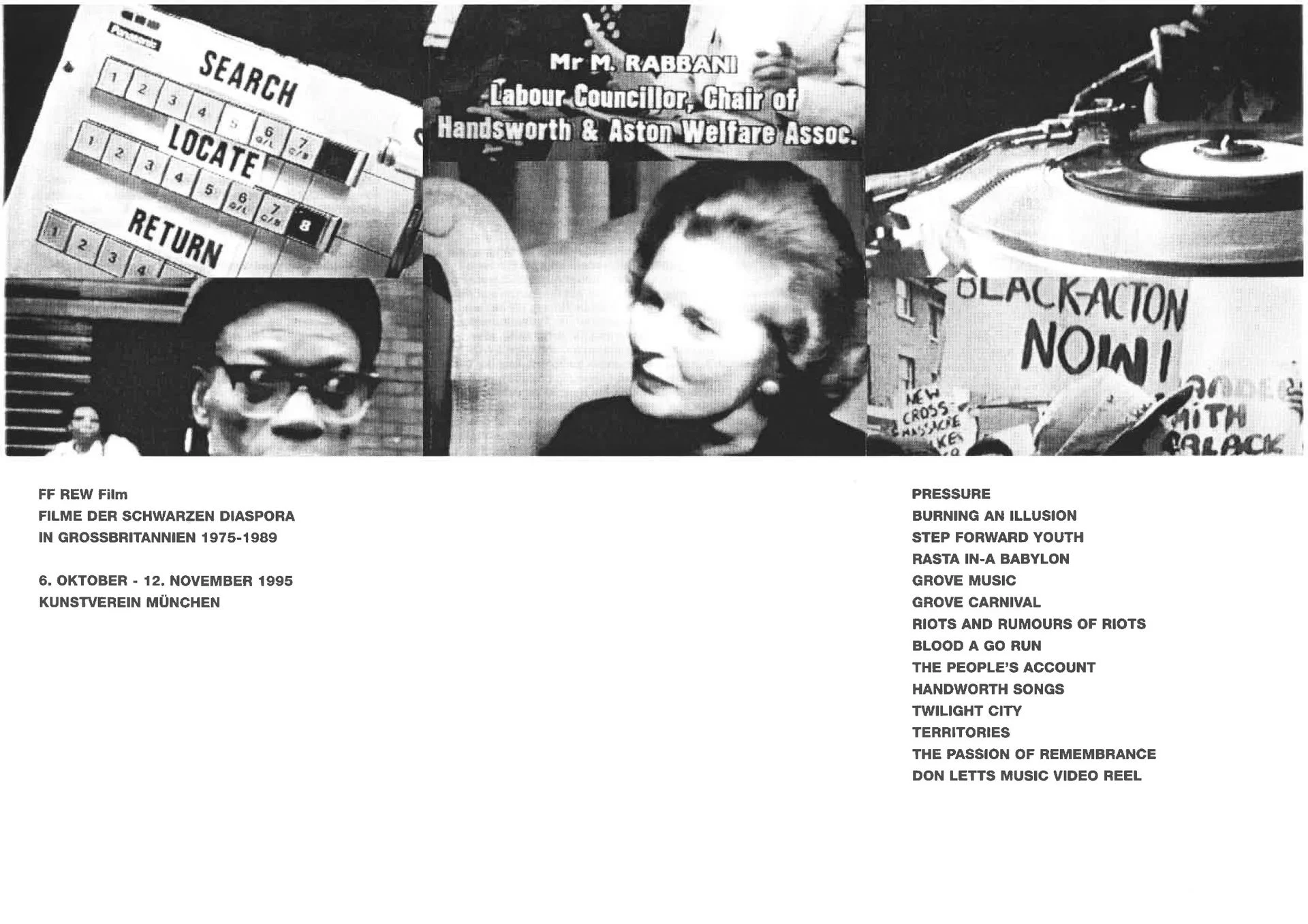 FF REW Film Filme der schwarzen Diaspora in Großbritannien 1975–1989 Oktober – 12. November 1995 Abb.: Ausstellungsflyer 1995, Courtesy Kunstverein München e.V.