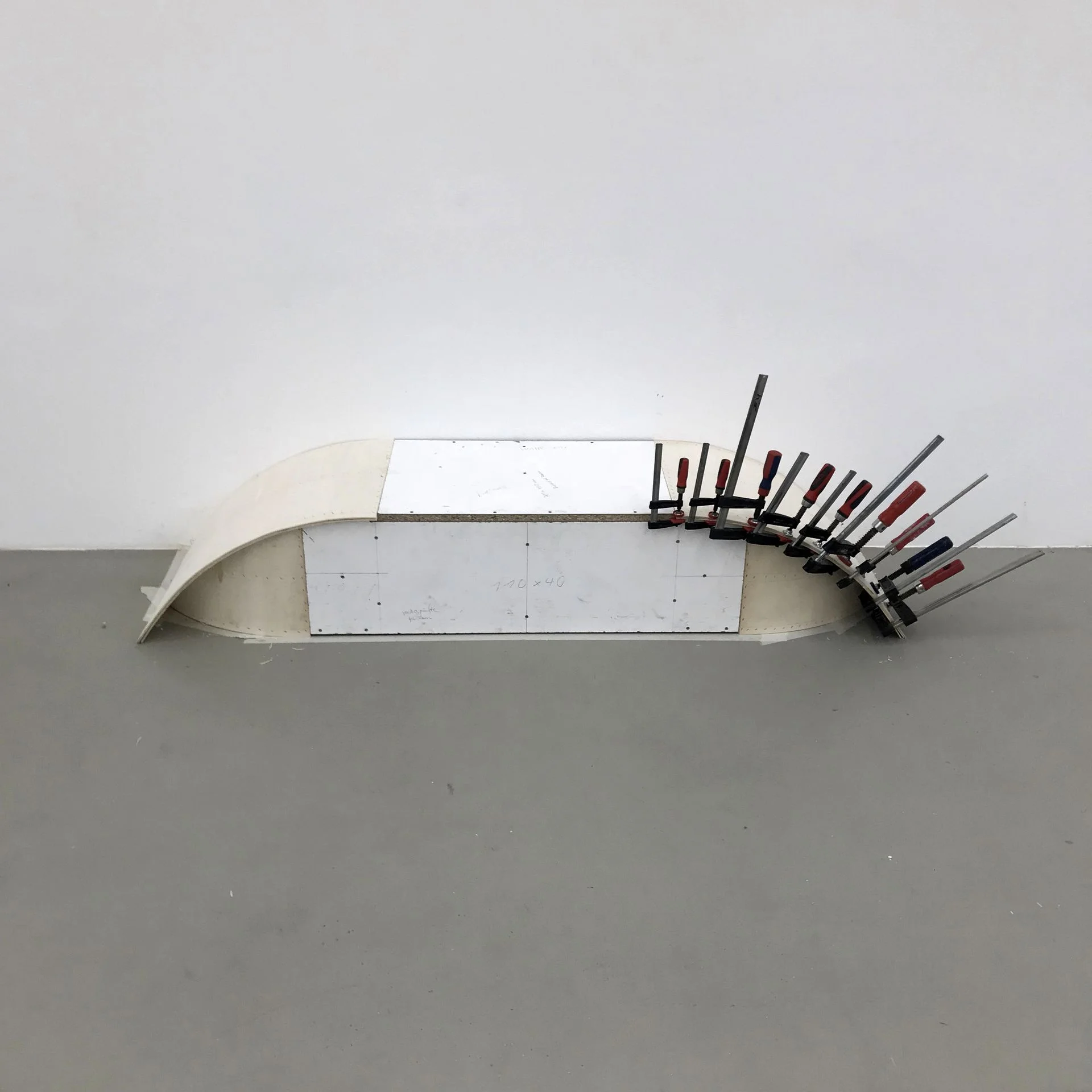 Ivo Rick hat eigens für das 1.OG des Kunstverein München die ortsspezifische Skulptur bridge glitch [bring your tongue in position for pronouncing the letter L] entworfen. Sie greift in die Architektur ein und interagiert mit ihr zugleich. Während der Jahresgaben diente sie als Szenografie, unterstützte die Werke anderer KünstlerInnen und schuf eine neue Dynamik im Ausstellungsraum.