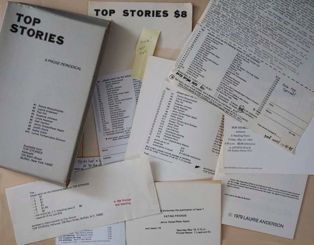 Die Künstlerin, Verlegerin und Autorin Anne Turyn wird im Gespräch mit der Kuratorin Gloria Hasnay Materialien aus ihrem Archiv präsentieren, die im Zusammenhang mit der Publikationsreihe Top Stories und anderen Aktivitäten stehen. Turyn gründete Top Stories 1978 als Zeitschrift für radikale und experimentelle Schreibformen, konzipiert als flexibles und erschwingliches Printmedium. Bis 1991 diente die Reihe über 29 Ausgaben hinweg als Plattform für unkonventionelle Texte von (hauptsächlich weiblichen) Autor*innen, Künstler*innen, Filmemacher*innen und Musiker*innen, darunter Kathy Acker, Laurie Anderson, Constance DeJong, Pati Hill und Cookie Mueller.