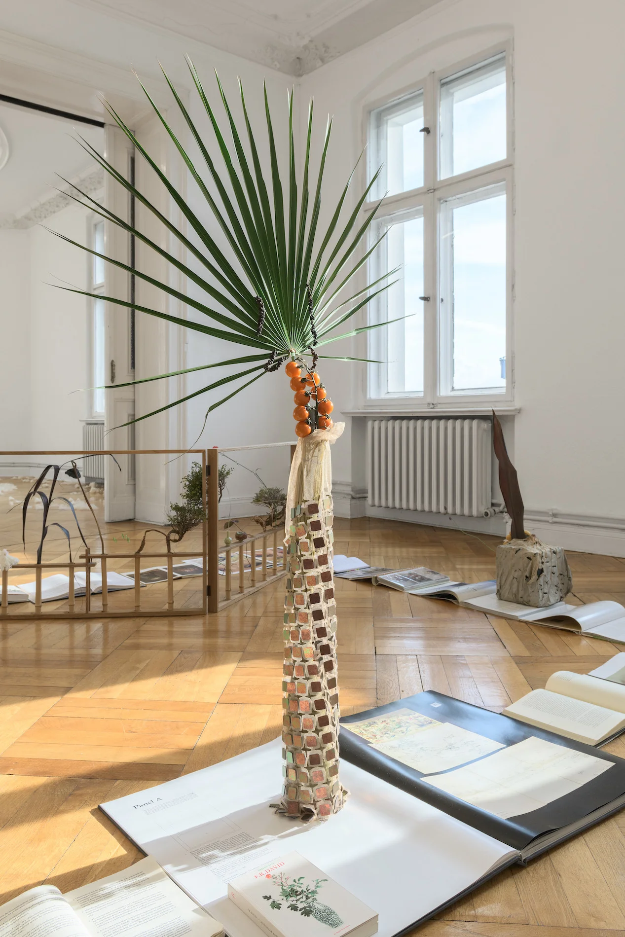 Abbildung: Christian Kōun Alborz Oldham, What Reader Emerges From Her Study Simplified?, Bücher, Steingut-Keramik, Palmette, Pfefferkorn, Polyestergewebe, Plastikstroh, Tomate, 2024; Foto: Julian Blum.